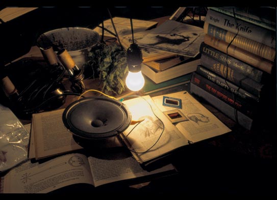Contained in a small shed-like space filled to the brim with nearly 2,000 individual records, eight record players, and twenty-four antique loudspeakers; the piece encapsulate a mysterious, melancholy, and mildly sinister mood, all while telling the story of the strange man who embodies the space between the sounds of various arias, sounds, songs, and pop music. The entire story is aligned with the change of synchronized light and colour.