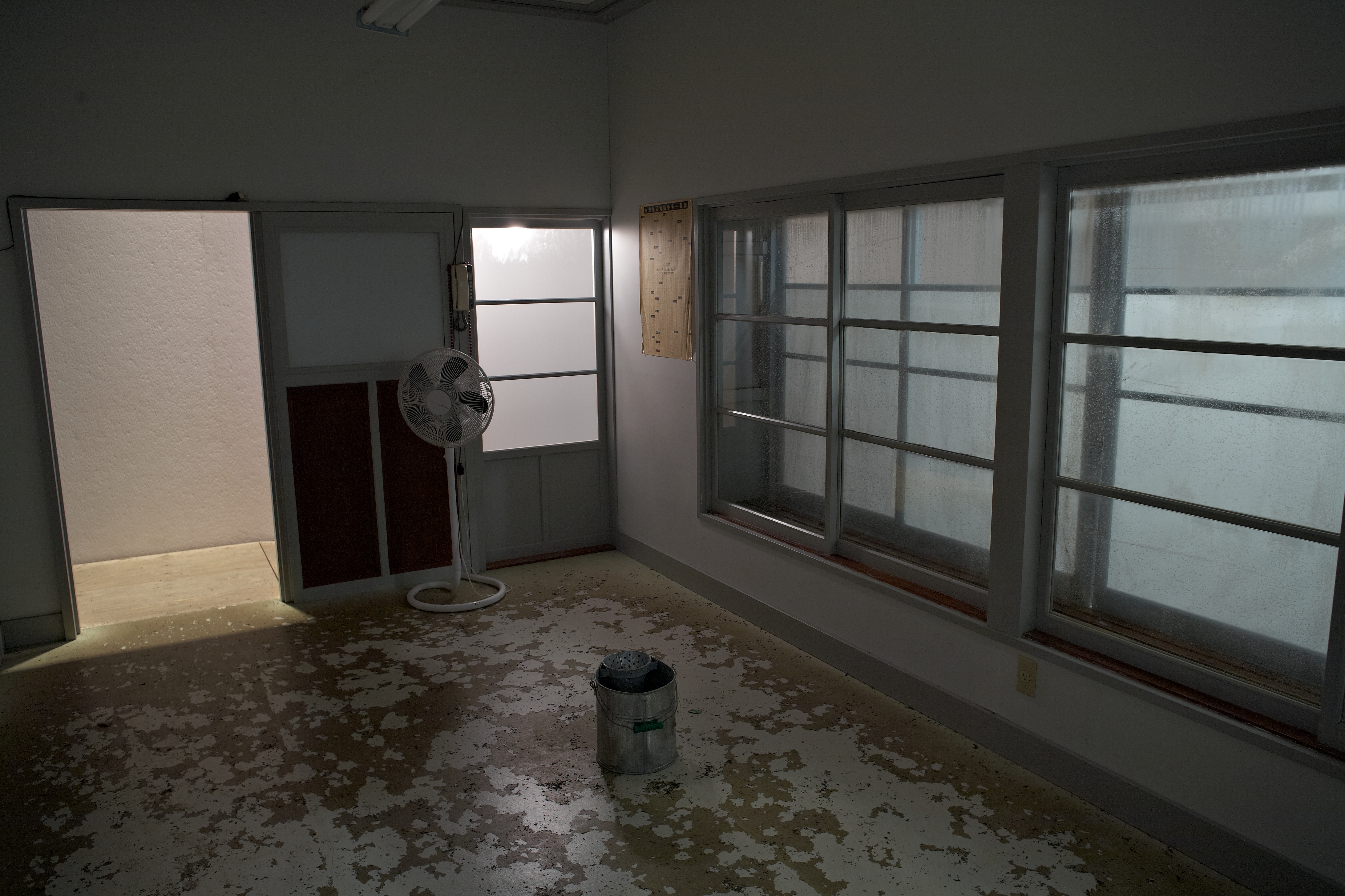 As water streams down the windows, and the rolling sound of thunder rattles the floor, you notice a roll of Japanese dental floss, buckets filling with water, a telephone, some old Japanese calendars, and a floor fan that only helps instil the uncomfortable quality of a 1960s Hiroshi Teshigahara film.