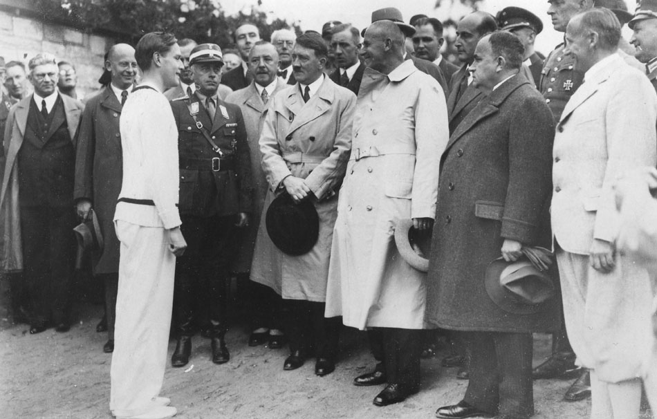 German chancellor meeting tennis player Gottfried von Cramm at the Deutschen Stadions in Grunewald, Berlin. At center is Reich Sports Leader Hans von Tschammer, as well as Secretary of State Hans Pfundtner. Further right is Secretary of the Interior, Dr. Wilhelm Frick, in back is architect Werner March. Photograph, 10 May 1933.
