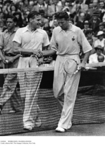 Tennis players Gottfried von Cramm of Germany and Don Budge of the United States at Wimbledon, London, England, 1937.