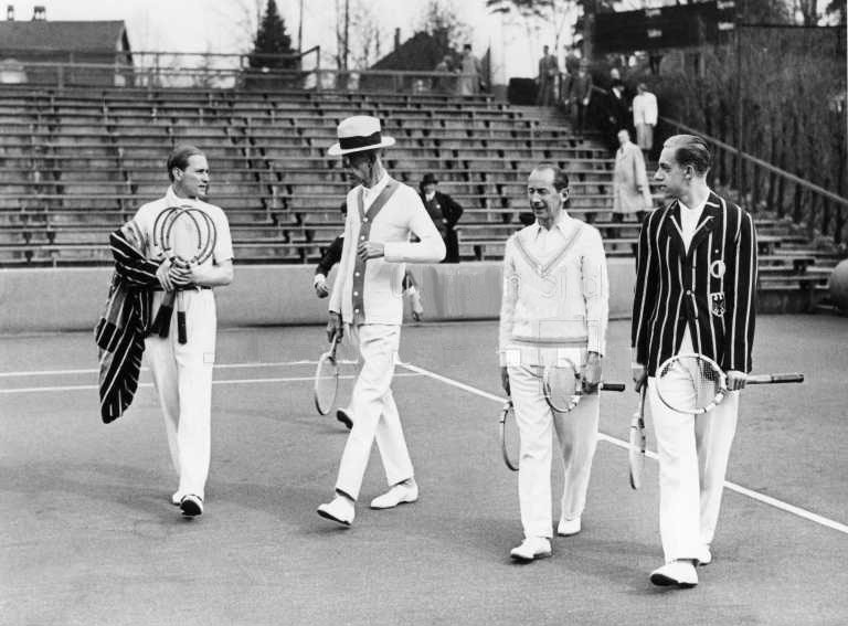 Gottfried von Cramm, Gustav V, Herr Kleinschroth und Heinrich Henkel auf der Anlage vom Tennis-Club Rot-Weiss in Berlin – 1935, Foto: Schirner