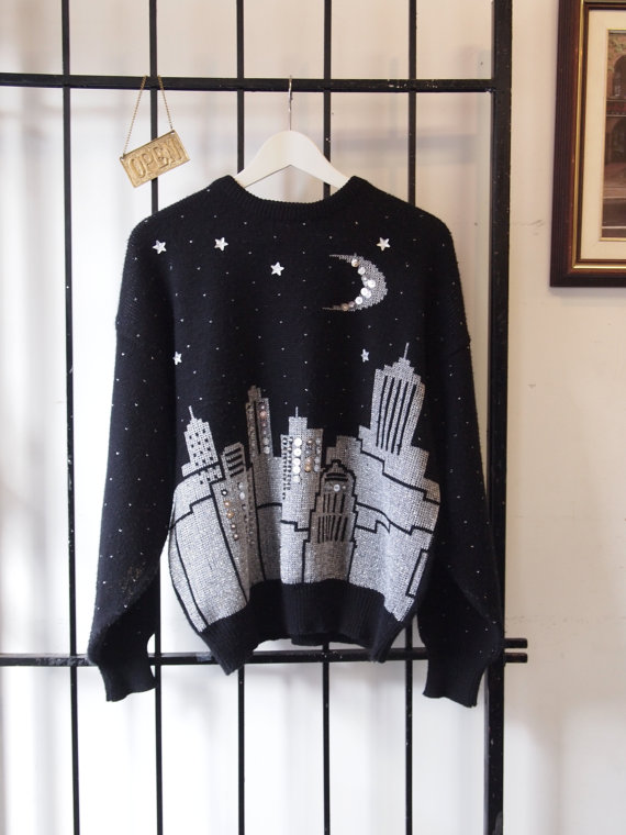 eof- suddenly seeking sweater girls- black and silver sequin graphic metallic city scape sweater