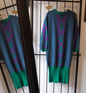 EOF – suddenly seeking sweater girls- vintage inspiration- green and purple graphic sweater dress