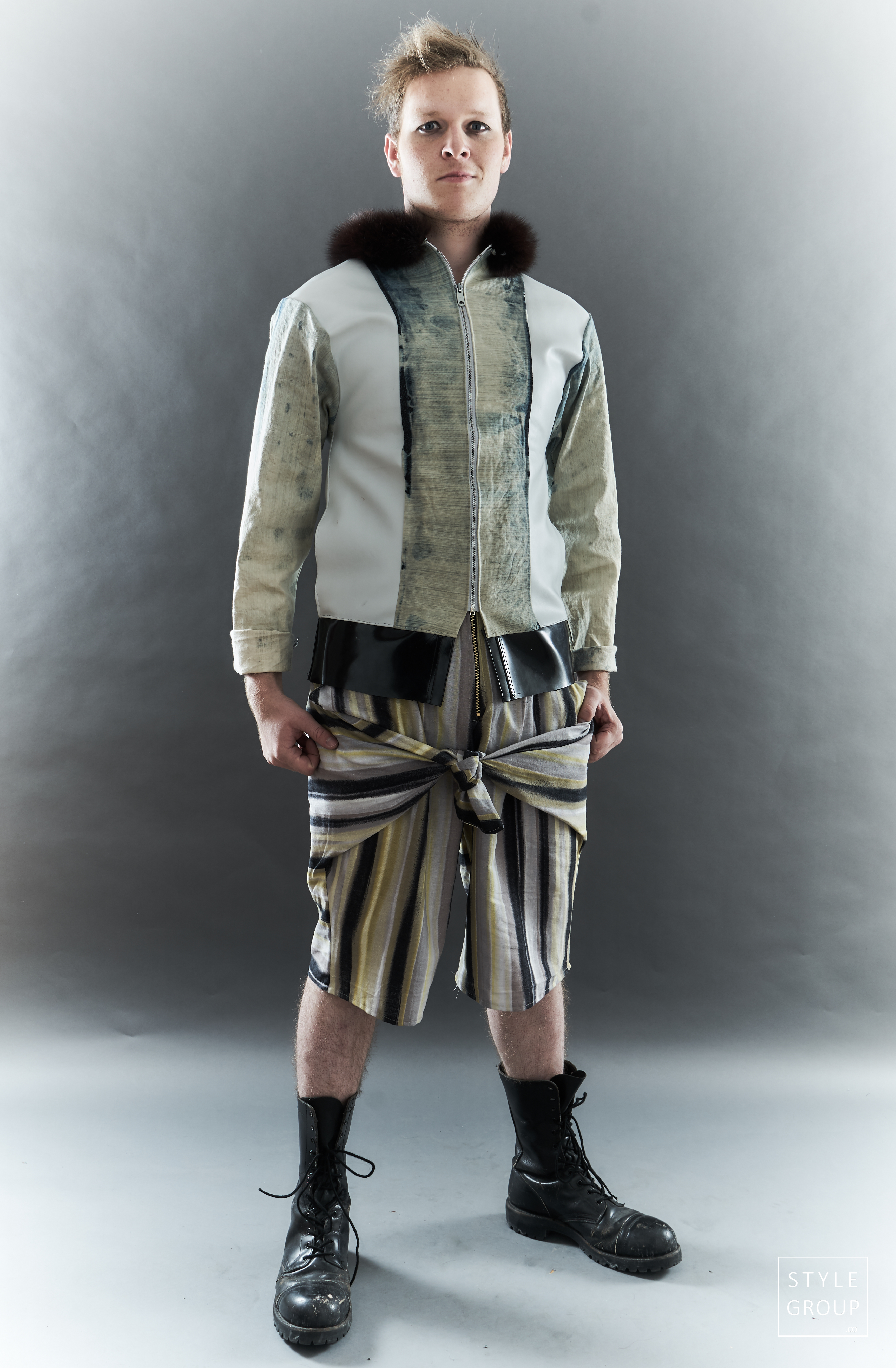 The Eye of Faith- Fashion Design- Distress Denim Handpainted Bomber Jacket: Stripe Linen Tie Shorts
